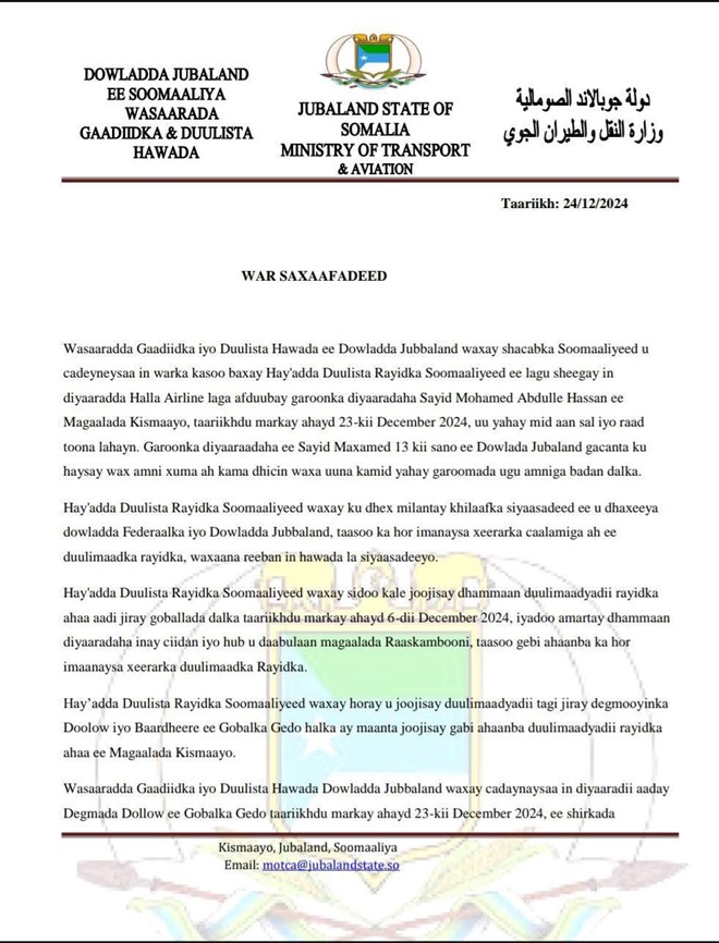 Talaado, December 24, 2024 (HOL) - War saxaafadeed ay soo saartay Wasaaradda Gaadiidka iyo Duulista Hawada ee Jubbaland waxa ay been abuur ku tilmaamtay eedeyn ay Hay'adda duulista Rayidka Soomaaliya ay ku sheegtay in Kismaayo lagu afduubtay diyaaradda Halla Airline 23-kii December 2024, waxaana ay wasaaraddu cadeeysay in Garoonka Kismaayo uusan ka dhicin wax amni xumi ah.
