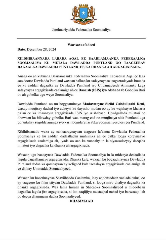 Sabti, December 28, 2024 (HOL) - Xubnaha labada aqal ee Baarlamaanka Federaalka Soomaaliya ee laga soo doorto Puntland, ayaa taageero buuxda u muujiyay dagaalka ay Puntland iyo ciidamadeeda amnigu kula jiraan kooxaha ISIS iyo Al-Shabaab, kuwaas oo ka hawlgala gobolka Bari.