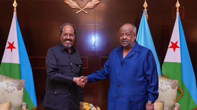 Axad, December 29, 2024 (HOL) - Madaxweynaha dowladda Federaalka Soomaaliya Xasan Sheekh Maxamuud ayaa maanta kulan kula qaatay xarunta Madaxtooyada dalka Jabuuti dhigiisa dalkaas Ismaaciil Cumar Geelle.