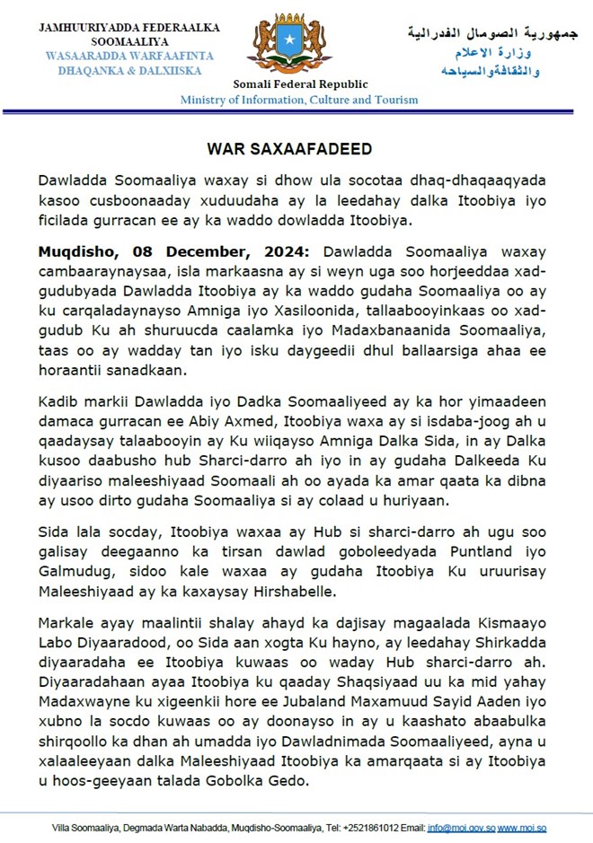 Axad, December, 8, 2024 (HOL) - Wasiir ku xigeenka Wasaaradda Warfaafinta Xukuumadda Fedaraalka Soomaaliya Cabdiraxmaan Yuusuf Alcaddaala oo maanta shir jaraa'id ku qabtay magaalada Muqdisho ayaa si kulul u cambaareyay talaabooyin uu tilmaamay iney ka hor imaanayaan Midnimada iyo Madaxbannaanida Soomaaliya oo ay Itoobiya ka wado gudaha dalka.