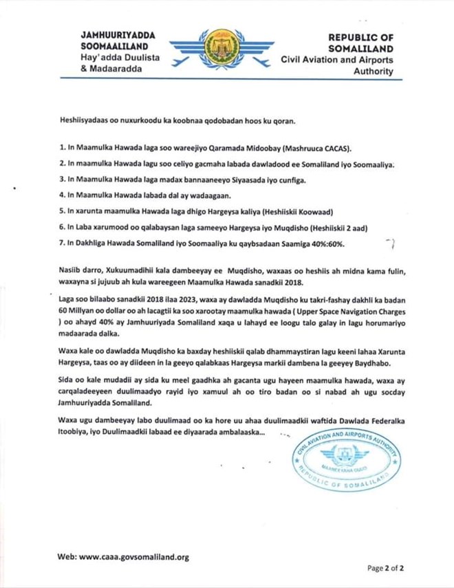 Talaado, February, 13, 2024 (HOL) - Somaliland ayaa sheegtay in dowlada Soomaaliya ay si qaldan uga faa'iidaysatay gacan ku haynta maamulka hawada.