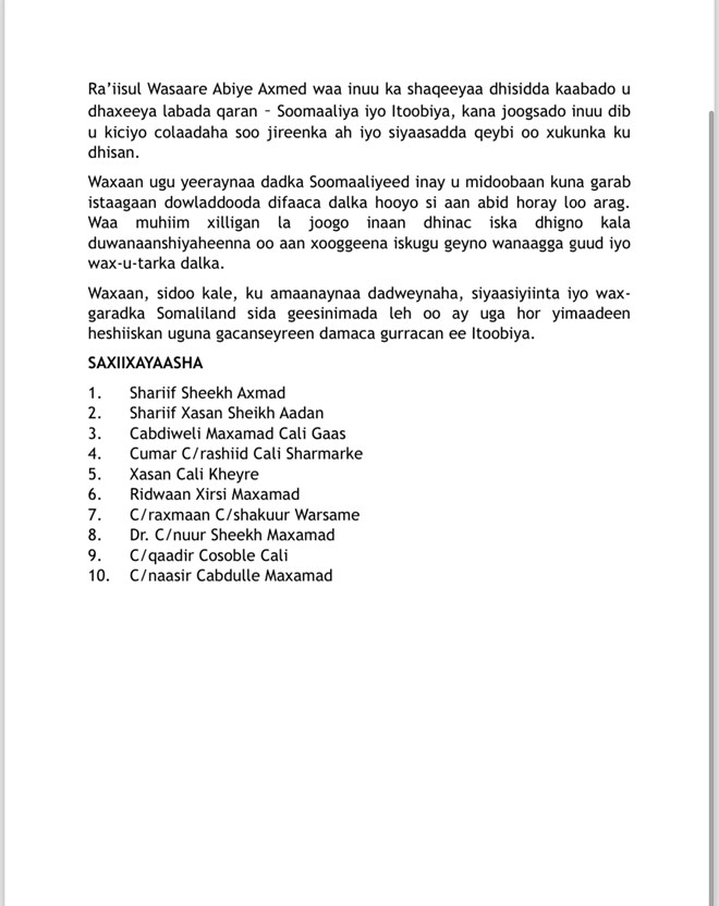Waxay ugu yeereen Ra’iisul Wasaare Abiye Axmed inuu ka shaqeeyo dhismaha buundooyinka isku xira labada ummadood oo uu ka waantoobo in uu dib u huriyo cadaawad soo jireen ah iyo siyaasad kala qaybsanaan.