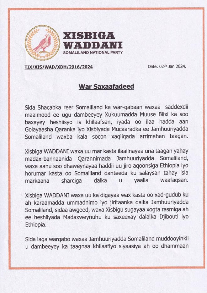 Talaado, January, 2, 2024 (HOL) - Xisbiga ugu wayn mucaaradka Somaliland ee Waddani ayaa soo dhaweeyay heshiiska Somaliland iyo Itoobiya, waxa uuna ku baaqay in la mariyo golaayasha sharci dajinta.