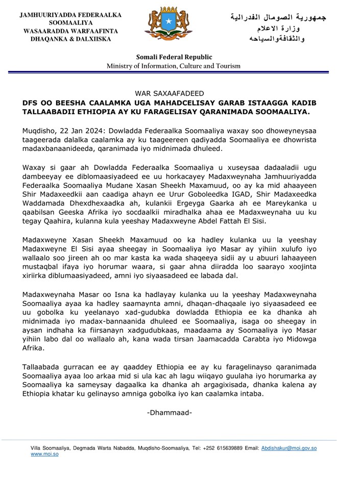 Dowlada Soomaaliya ayaa waxii ka dambeeyay heshiiskii Itoobiya ay Addis Ababa kula gashay bilowgii bishaan Somaaliland sameeysay dadaalo diblumaasiyadeed oo kaga hortageyso damaca iyo xadgudubka Itoobiya ku dooneyso qeyb ka mid ah dhulka Soomaaliya.