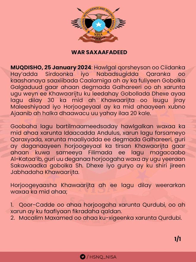 Khamiis, January, 25, 2024 (HOL) - Hay'adda Nabadsugida iyo Sirdoonka Qaranka Soomaaliya ayaa faahfaahin dheeraad ah ka bixisay howlgal qorsheysan oo ay iska kaashadeen ciidanka NISA iyo kuwa saaxiibada Caalamka oo Xalay ka dhacay degmada Galhareeri ee gobolka Galgaduud.