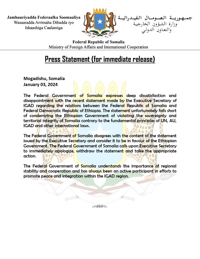 Arbaco, January, 3, 2024 (HOL) - Dowladda Fedaraalka Soomaaliya ayaa ka hortimid bayaan maanta Urur goboleedka IGAD, kasoo dowladda Soomaaliya ay u aragtay mid aan dhex dhaexaad aheyn oo lagu taageerayo dowladda Itoobiya.