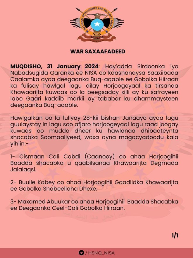 Arbaco, January, 31, 2024 (HOL) - Hawlgal ay iska kaashadeen hay’adda nabad sugidda ee NISA iyo Saaxiibada caalamka ayaa laga fuliyay deegaanka Buq-aqable ee Gobalka Hiiraan, halkaas oo la sheegay in lagu soo afjaray nolosha 6 horjooge oo katirsan Shabaab.