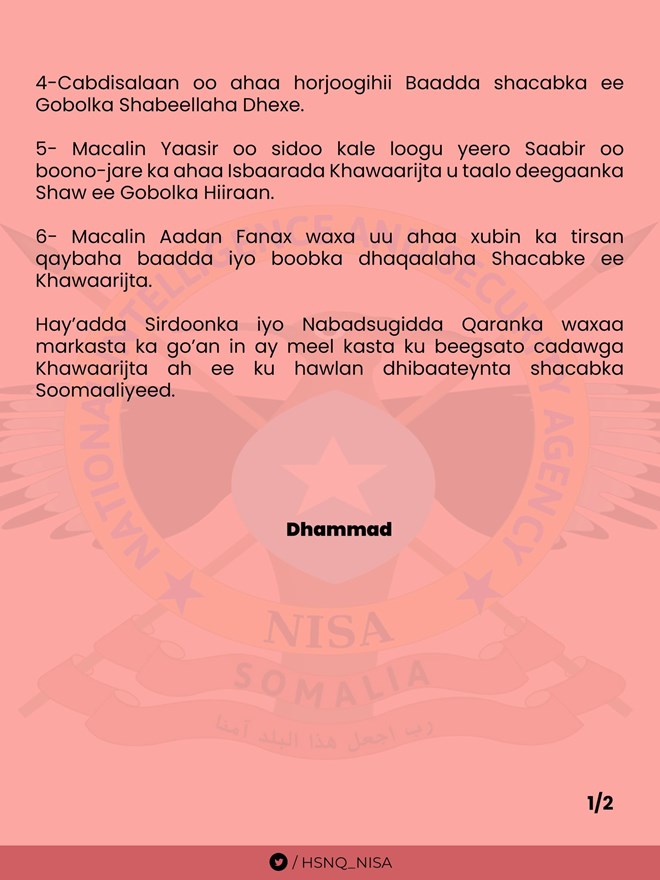 Howlgalkaan oo la fuliyay 28kii bishaan ayaa NISA waxay soo bandhigtay magacyada horjoogayaasha Alshabaab ee lagu qaarijiyay howgalka ay iskaashadeen saaxiibada shisheeye.