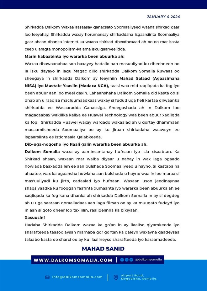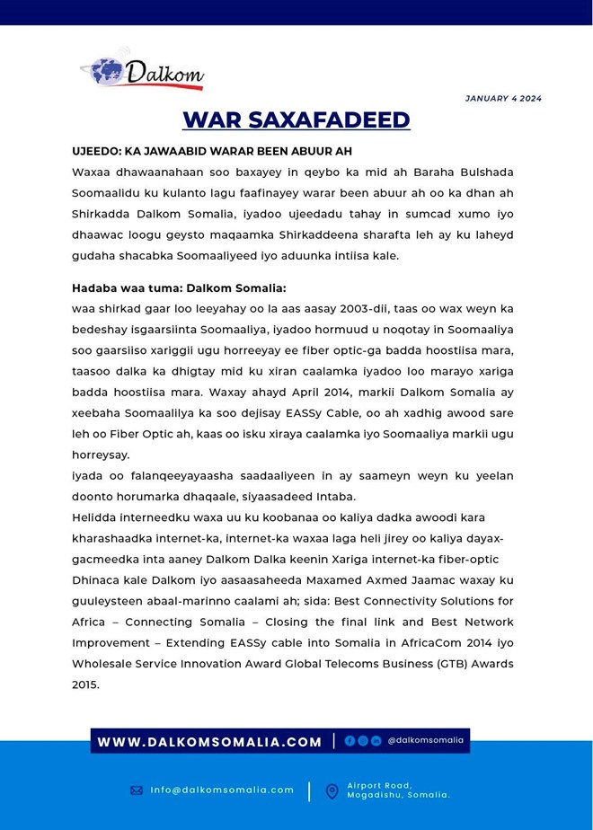 Sabti, January, 6, 2024 (HOL) - Shirkadda Dalkom oo kamid ah shirkadaha bixiyaha adeegga isgaarsiinta internetka ayaa beenisay warar baraha bulshada lagu faafiyay oo ay shirkadu u aragto in ujeeddada laga leeyahay ay tahay in lagu magac dilo sumcadda shirkadda.
