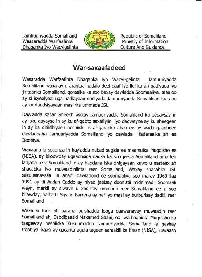 newsinsideWarsaxaafadeed kasoo baxday Wasaarada Warfaafinta Somaliland, oo lagaga jawaabay eedaynta dowlada Soomaaliya, ayaa lagu sheegay in sirdoonka dowlada federaalku uu maalmihii u danbeeyay beegsi ku hayay dadka kasoo jeeda Somaliland ee ku sugan magaalada Muqdisho, isla markaana qaar kood gacan ka hadal lagu weeraray.