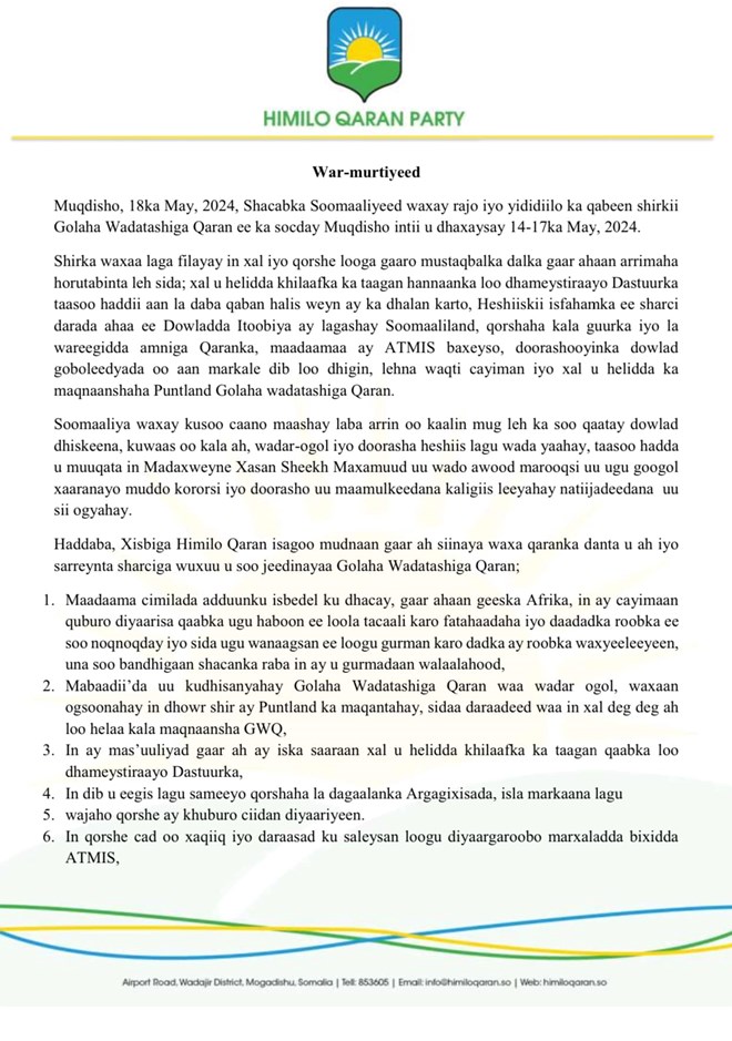 Hoggaamiyaha xisbiga Himilo Qaran wuxuu sheegay in dowladda looga baahan yahay inay masuuliyad iska saarto xal u helidda khilaafka iyo kala qeybsanaanta ka dhalatay hannaanka loo dhameystirayo dastuurka dalka.