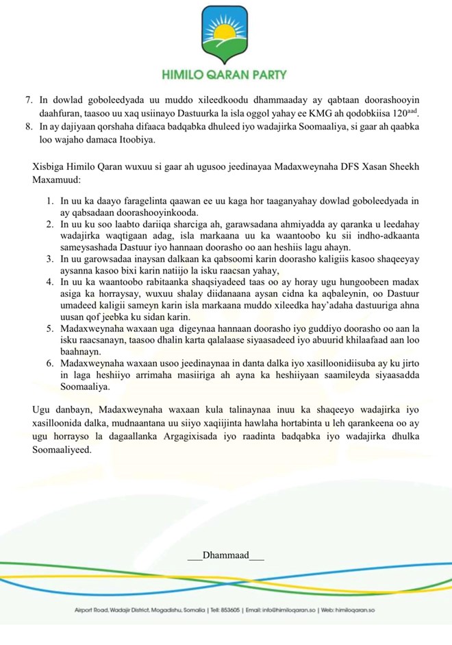 newsinsideShariif Sheikh Axmed oo hoggaamiyaha xisbiga Himilo Qaran ayaa war saxaafadeed uu soo saaray xisbigiisa, waxaa uu ku sheegay in aysan dalka ka qabsoomi karin doorasho aan loo dhamayn, isagoo madaxweynaha Soomaaliya uga digay inuu dalka u horseedo qalalaase siyaasadeed.