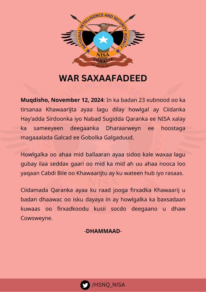 Talaado, November, 12, 2024 (HOL) - Hay'adda Sirdoonka iyo Nabad Sugidda Qaranka ee NISA ayaa sheegtay in howlgal qorshaysan ay ku dileen ilaa 23 xubnood oo ka tirsan Alshabaab, halka tiro kale oo ka tirsan kooxdan la dhaawacay.