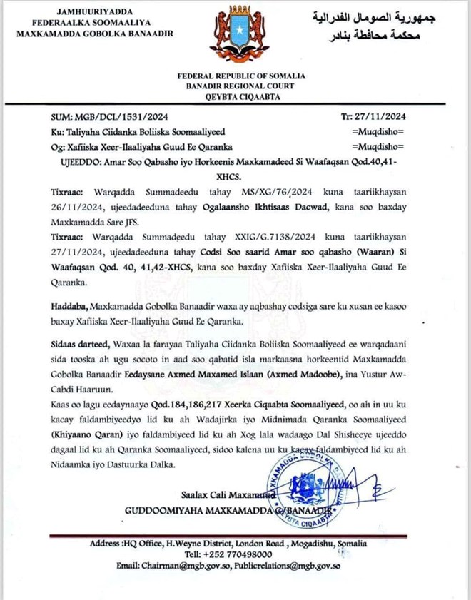Maxkamadda gobolka Banaadir ayaa qoraalkeeda ku sheegtay in amarkan lagu soo saaray codsi ka yimid Xafiiska Xeer ilaaliyaha guud ee Qaranka, kaasoo Axmed Madoobe ku eedeyay inuu galay dambiyo waa weyn oo ay ka mid yihiin Khayaano Qaran iyo falal liddi ku ah midnimada Qaranka Soomaaliyeed.
