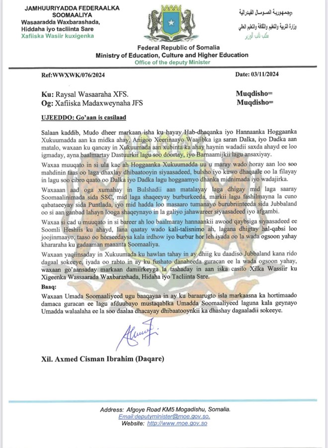 Axad, November, 3, 2024 (HOL) - Xildhibaan Axmed Cisman Ibrahim (Daqare) oo ahaa wasiir ku xigeenkii waxbarashada, hiddaha iyo tacliinta sare ee xukuumadda Soomaaliya, ayaa ku dhawaaqay in uu iska casilay xilkiisii. Waa wasiirkii labaad oo kasoo jeeda Jubbaland oo iska casila xukuumadda Soomaaliya.