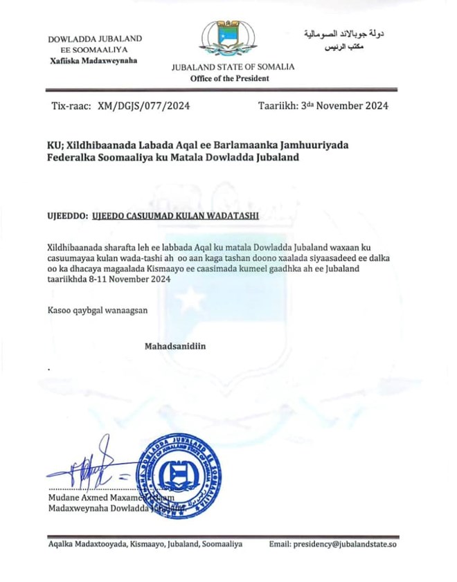 newsinsideWarqadda kasoo baxday Xafiiska Madaxweyne Axmed Madoobe ayaa u qorneeyd "Xildhibaanada sharafta leh ee labbada Aqal ku matala Dowladda Jubaland waxaan ku casuumayaa kulan wada-tashi ah oo aan kaga tashan doono xaalada siyaasadeed ee dalka oo ka dhacaya magaalada Kismaayo ee caasimada kumeel gaarka ah ee Jubaland taariikhda 8-11 November 2024".