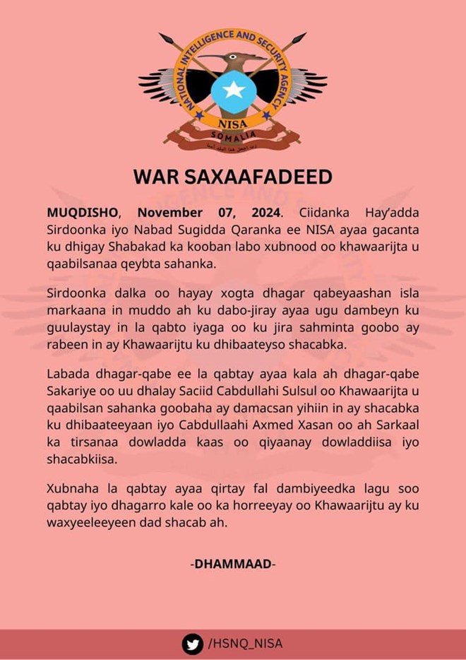"Labada dhagar qabe ee la qabtay ayaa kala ah dhagar-qabe Sakariye oo uu dhalay Saciid Cabdullahi Sulsul oo Khawaarijta u qaabilsan qaybta sahanka goobaha ay damacsan yihiin in ay shacabka ku dhibaateeyaan ee Gobalka Banaadir iyo Cabdullaahi Axmed Xasan oo ah Sargaal ka tirsanaa dowladda kaas oo qiyaanay dowladdiisa iyo shacabkiisa" ayaa lagu yiri qoraalka kasoo baxay NISA.