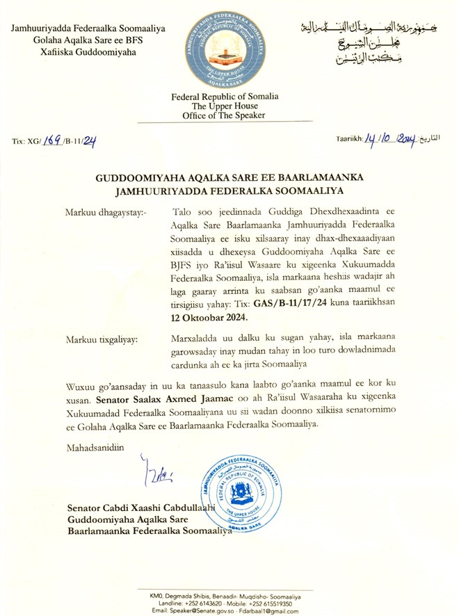 newsinsideWar qoraal ah oo uu soo saaray guddoomiye Cabdi Xaashi Cabdullaahi ayaa lagu sheegay inuu u tanaasulay Raysal wasaare ku xigeenka Xukuumadda kadib talo bixino uu sheegay iney uga yimaadeen dhinacyo dhexdhaxaadiyaal ah, wuxuuna shaaciyay in Saalax Axmed Jaamac uu sii wadan doono shaqadiisa Senatarnimo.