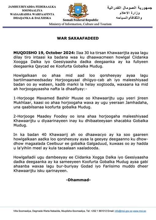 Sabti, October, 19, 2024 (HOL) - Warsaxafadeed kasoo baxay Wasaaradda Warfaafinta Xukuumadda Fedaraalka Soomaaliya ayaa lagu faahfaahiyay howlgalo saacadahii lasoo dhaafay ciidanka xoogga dalka iyo kuwa dadka deegaanka ka fuliyeen Koonfurta gobolka Mudug.