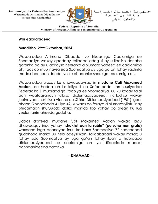Talaado, October, 29, 2024 (HOL) - Wasaaradda Arrimaha Dibadda iyo Iskaashiga Caalamiga ee Dowladda Soomaaliya ayaa sooo saartay amar uu dalka uga baxayo Cali Maxamed Aadan, oo hadda ah qunsul ku xigeenkan labaad ee Safaaradda Itoobiya ee Soomaaliya.