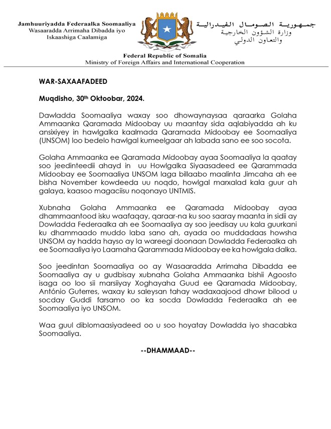 Khamiis, October, 31, 2024 (HOL) - Dowladda Federaalka ah ee Soomaaliya ayaa soo dhaweysay go’aankii Golaha Ammaanka ee Qaramada Midoobay uu ku ansixiyay in Xafiiska Qaramada Midoobay ee Kaalmaynta Soomaaliya (UNSOM) loo beddelo howlgal KMG ah.