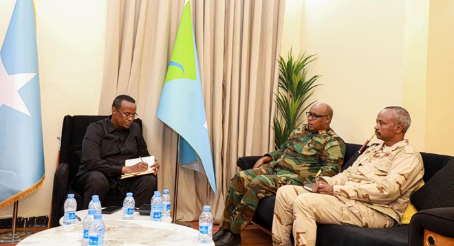 Talaado, September, 17, 2024 (HOL) - Madaxweynaha maamulka Hirshabeelle Cali Cabdullaahi Xuseen Guudlaawe iyo Taliyaha ciidanka xoogga dalka Soomaaliyeed Sareeye Gaas Ibraahin Sheekh Muxudiin oo uu wehliyo Taliyaha Lugta ee ciidanka xoogga Dayax Cabdi Cabduulle ayaa ka shiray sidii Al-shabaab looga xureyn lahaa inta u dhaxeysa degmooyinka Jowhar iyo Balcad.
