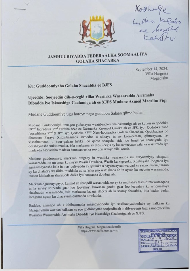 Sabti, September, 28, 2024 (HOL) - Qaar ka mid ah mudanayaasha Golaha Shacabka ayaa maanta guddoonka Golaha u gudbiyay Mooshin ka dhan ah Wasiirka Wasaaradda arrimaha Dibadda iyo Iskaashiga Caalamiga ee Xukuumadda Fedaraalka Soomaaliya Axmed Macalin Fiqi.