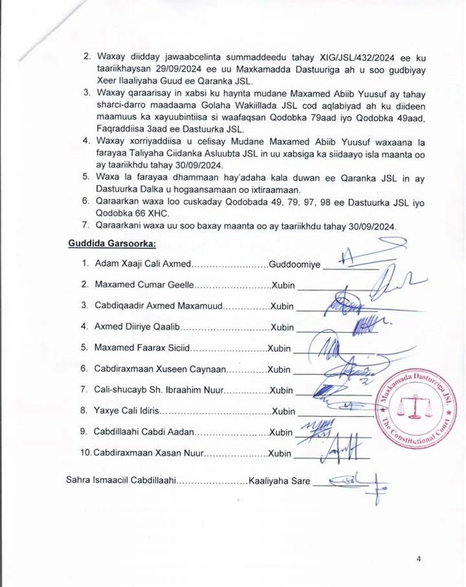 "Waxa la farayaa dhammaan hay’adaha kala duwan ee qaranka JSL in ay dastuurka dalka u hogaansamaan oo ixtiraamaan" ayay maxkamadu ku tidhi qaraarka.