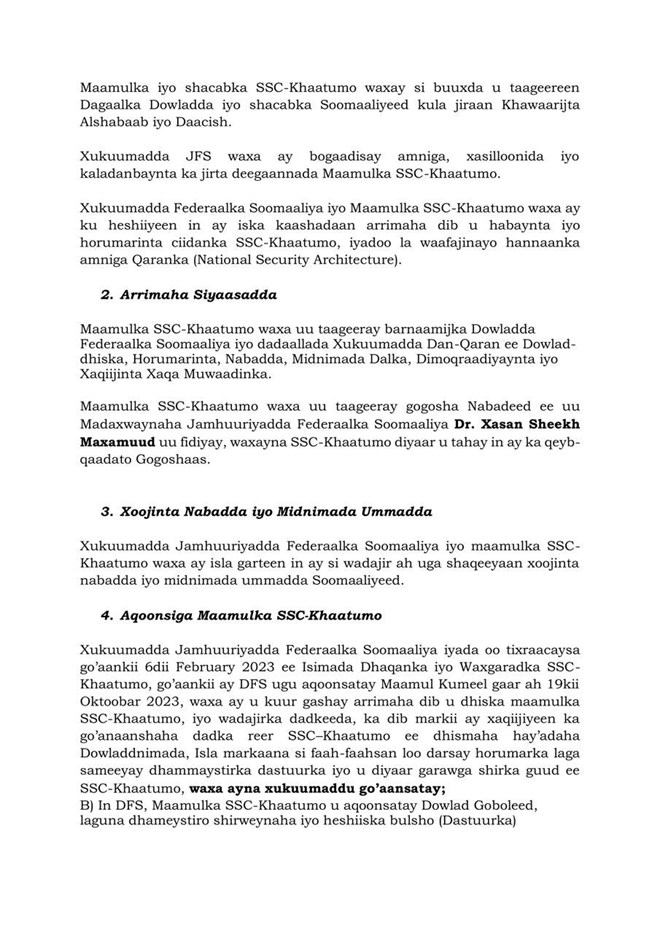 Waxaa sidoo kale la isla meel dhigay in maamulka SSC-Khaatumo uu noqdo dowlad goboleed rasmi ah iyo xubin buuxda oo ka tirsan Golaha Wadatashiga Qaranka (NCC), ayna deegaanadoodu yihiin qeyb ka mid ah dhulka Dowladda Federaalka Soomaaliya.