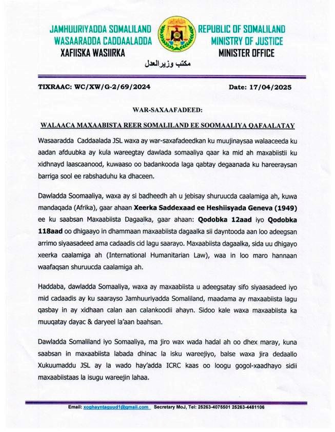 Khamiis, April 17, 2025 (HOL) - Xukuumadda Somaliland ayaa mar kale tallaabadii ay Dowladda Soomaaliya 25 maxbuus oo ka mid ah maxaabiista Somaliland ee Laascaanood ku xidhan ugu qaaday Muqdisho ku tilmaantay afduub, waxayna ugu baaqday inay ku wareejiso Hay’adda Caalamiga ah ee Laanqayrta Cas (ICRC) oo qaabilsan arrimaha maxaabiista.