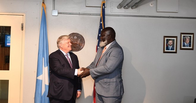 Sabti, Agoosto 2, 2025 (HOL) - Safiirka Mareykanka ee Soomaaliya, Danjire Riley, ayaa ku qaabilay xarunta safaaradda El Hadji Ibrahima Diene, oo ah Wakiilka Midowga Afrika u qaabilsan Soomaaliya, waxaana ay kawada hadleen dagaalka Al Shabaab.