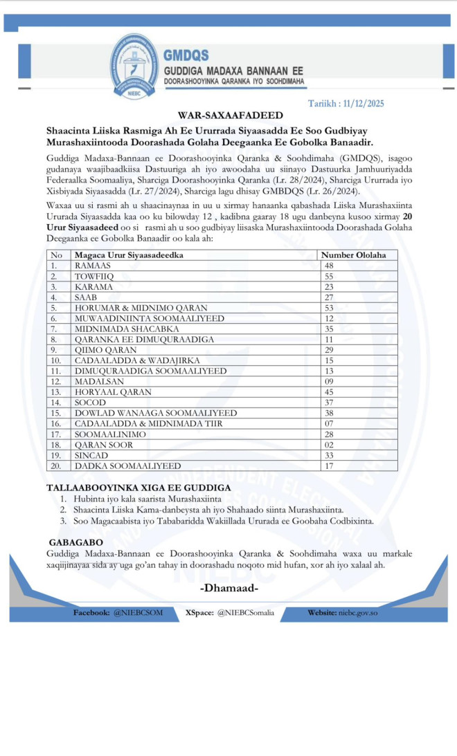 Jimco, December 12, 2025 (HOL) - Guddiga doorashooyinka Qaranka ayaa xalay si rasmi ah u shaaciyay in 20 Urur Siyaasadeed ay soo dhameystireen musharaxiinta kaga qaybgelaysa doorashada Golaha deegaanka ee degmooyinka gobolka Banaadir.