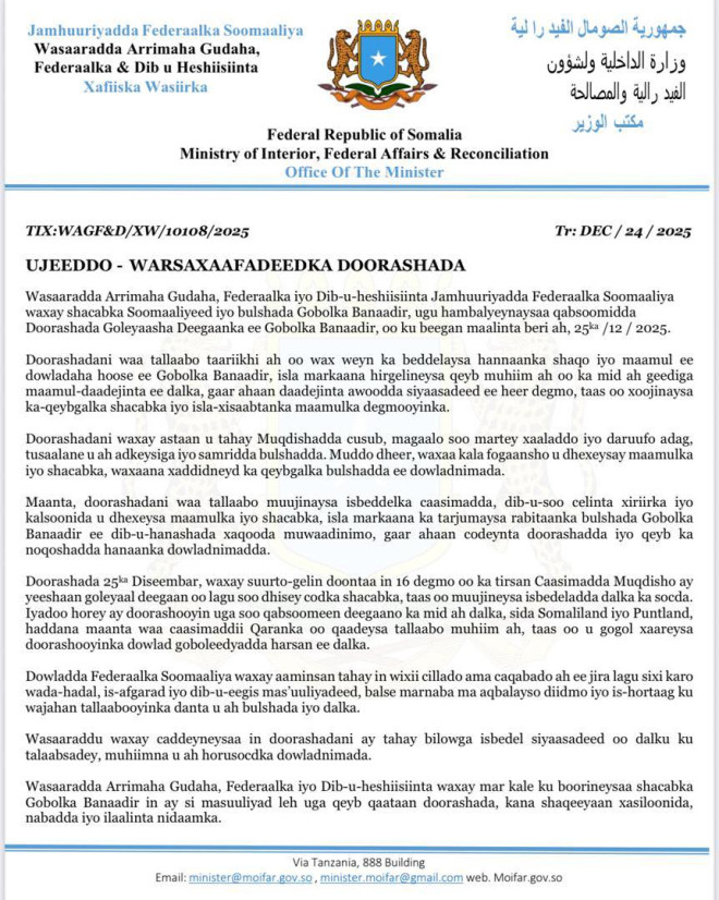 Arbaco, December 24, 2025 (HOL) - Wasaaradda Arrimaha Gudaha Federaalka iyo dib u heshiisiinta Xukuumadda Soomaaliya ayaa soo saartay Warsaxafadeed ku aaddan doorashada goleyaasha deegaanka degmooyinka gobolka Banaadir oo lagu wado iney berito qabsoonto.