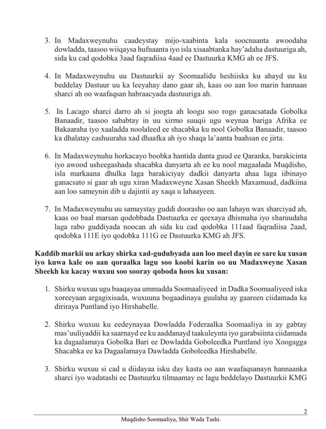 Sidoo kale waxa ay War saxaafadeedka Shirka laga soo saaray ay ku sheegeen in Madaxweynaha uu caadeystay mijo-xaabinta kala soocnaanta awoodaha dowladda, taasoo wiiqaysa hufnaanta iyo isla xisaabtanka hay'adaha dastuuriga ah, sida ku cad qodobka 3aad faqradiisa 4aad ee Dastuurka KMG ah ee JFS sidoo kale in Lacago sharci darro ah si joogta ah loogu soo rogo ganacsatada Gobolka Banaadir, taasoo sababtay in uu xirmo suuqii Bakaaraha.