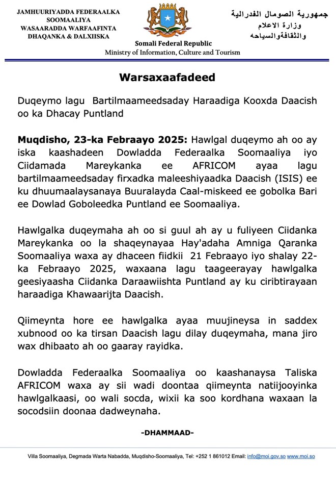 Axad, February 23, 2025 (HOL) - Saddex dagaalame oo katirsan ISIS ayaa lagu dilay howlgal duqeyn ah oo si wadajir ah u fuliyeen Dowladda Federaalka Soomaaliya iyo Taliska Ciidamada Mareykanka ee Afrika (AFRICOM) kaasoo ka dhacay Buuraha Caal Miskeed ee Puntland.