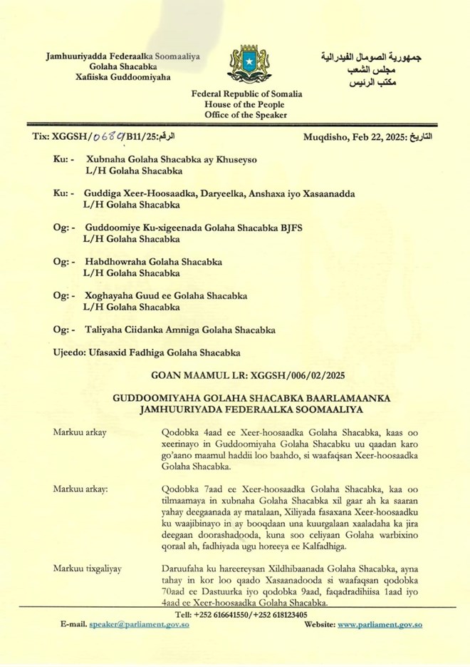 Axad, February 23, 2025 (HOL) - Guddoomiyaha Golaha Shacabka ee Baarlamaanka Jamhuuriyadda Federaalka Soomaaliya, Sheekh Aadan Maxamed Nuur (Madoobe), ayaa dib ugu fasaxay 15 xildhibaan oo ka tirsan Golaha Shacabka ka qeyb galka fadhiyada guud ee Golaha kalfadhiga lixaad.