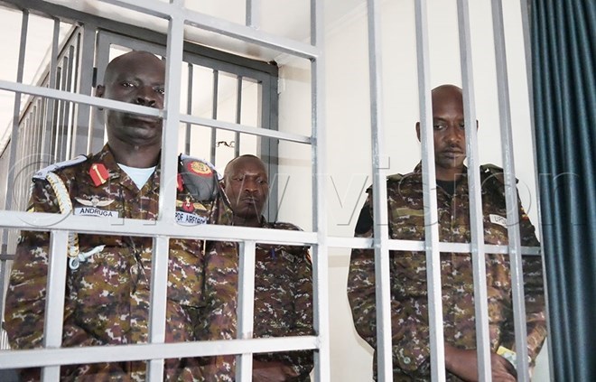 Col. George Buga Andruga, 51, Maj. Benjamin Kashumbusha, 43, iyo Lt. Henry Gygenda, 38, ayaa ka soo hor muuqday Maxkamadda Guud ee Ciidamada Qalabka Sida ee Makindye ee Kampala January 15, 2025.