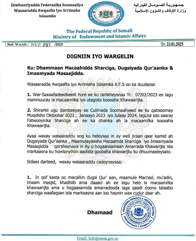 Khamiis, January 23, 2025 (HOL) - Warsaxafadeed kasoo baxay Wasaaradda Awqaafta iyo arrimaha Islaamka ee Xukuumadda Fedaraalka Soomaaliya ayaa digniin adag loogu diray macallimiinta Dugsiyada Qur’aanka, maamulayaasha macaahidda sharciga iyo Imaamyada Masaajida ineysan la shaqeyn karin Al-Shabaab.