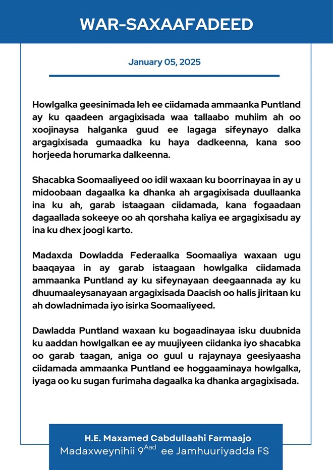Axad, January 5, 2025 (HOL) - Madaxweynihii hore ee Soomaaliya Maxamed Cabdullahi Farmaajo ayaa bogaadiyay Howlgalka ay ciidamada ammaanka Puntland ay ku qaadeen Kooxda Daacishta Soomaaliya, waxaana uu ku tilmaamay tallaabo muhiim ah oo xoojinaysa halganka guud ee lagaga sifeynayo dalka argagixisada.
