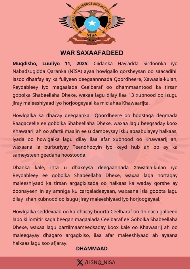 Jimco, Luulyo 10, 2025 (HOL) - Ciidamada Hay’adda Sirdoonka iyo Nabadsugidda Qaranka (NISA) ayaa qaaday howlgallo qorsheysan oo ka dhacay deegaanno dhowr ah oo ka tirsan gobolka Shabeellaha Dhexe, kuwaas oo lagu dilay 13 xubnood oo ka tirsan kooxda Al Shabqab, oo ay ku jireen horjoogeyaal iyo maleeshiyaad.