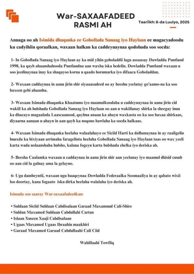 Arbaco, Luulyo 9, 2025 (HOL) - Isimada dhaqanka ee gobollada Sanaag iyo Haylaan, ayaa si wadajir ah u soo saaray war-saxaafadeed ay ku caddeynayaan mowqifkooda ku aaddan arrimaha siyaasadeed ee gobolka, iyo shirar la sheegay in lagu qabanayo magaalada Laascaanood.
