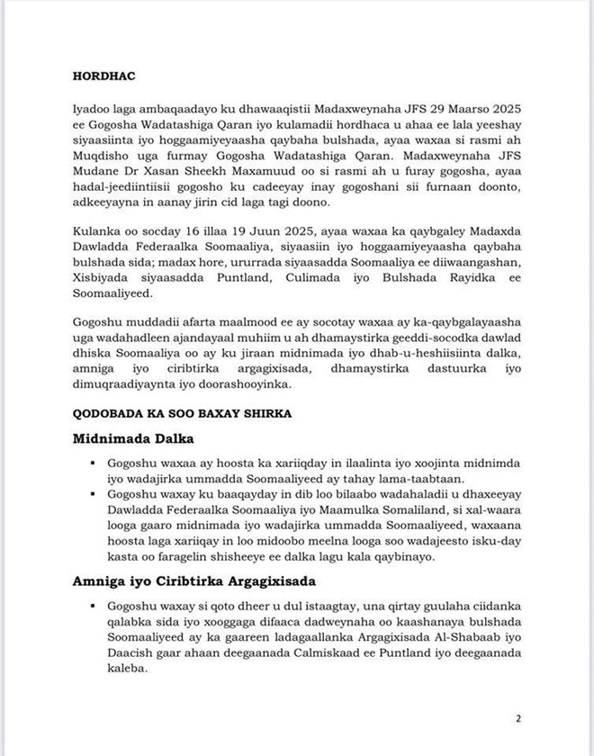 Khamiis, Juun 19, 2025 (HOL) - Waxaa maanta magaalada Muqdisho lagu soo gabagabeeyay Shirkii gogoshada wadatashiga qaran ee afartii cisho ee lasoo dhaafay ka socday magaalada Muqdisho kaa uu isniintii lasoo dhaafay furay madaxweynaha Soomaaliya Xasan Sheekh Maxamuud, waxaana ka qeyb galay madaxda Dowladda, Siyaasiyiin, Ururada Siyaasadda ee ka diiwan gashan Guddiga Doorashooyinka.