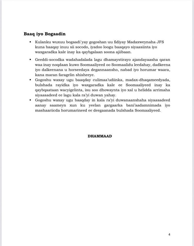 newsinsideWar Murtiyeedka laga soo saaray Shirkaan waxa qodobada ugu muhiimsan kamid ahaa in dib loo bilaabo wada hadaladii u dhaxeeyay Soomaaliya iyo Somaliland loona midoobo isku day kasta oo dalka lagu kala qeybinayo.