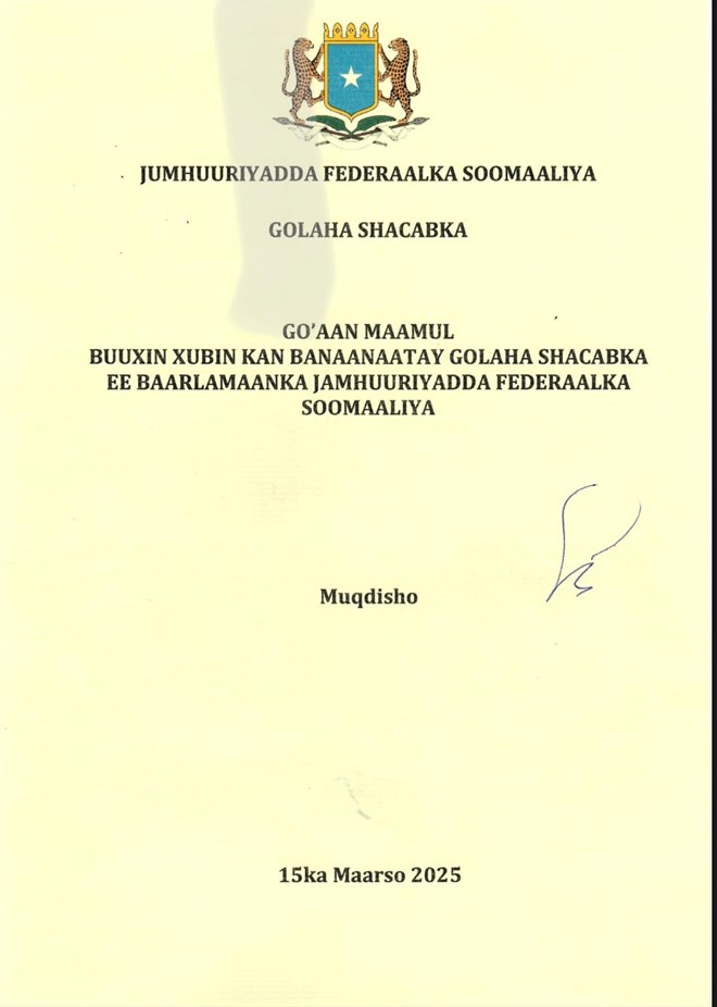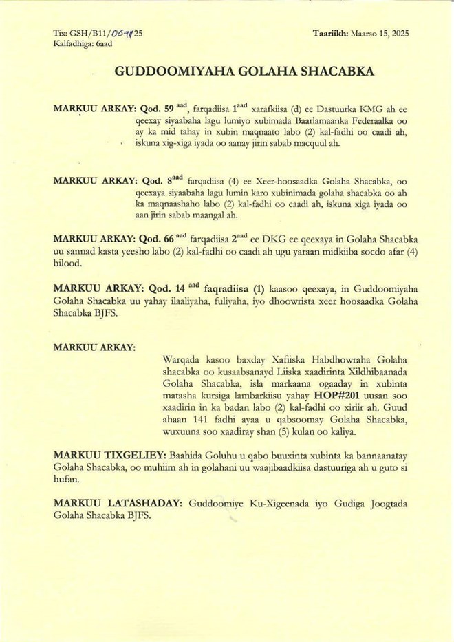 Sabti, Maarso 15, 2025 (HOL) - Guddoomiyaha Golaha Shacabka ee Baarlamaanka Jamhuuriyadda Federaalka Soomaaliya Sheekh Aadan Maxamed Nuur (Madoobe) ayaa sheegay in mudane ka tirsanaa golaha shacabka uu lumiyay xubinimadiisii Golaha, sidaasi daraadeedna looga baahanyahay hay’adaha ku shaqada leh in ay soo buuxiyaan kursiga lambarkiisu yahay Hop201.