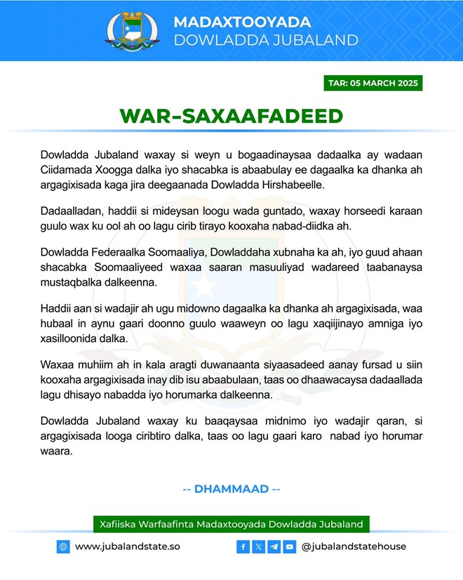 Warsaxafadeedkaan kasoo baxay maamulka Jubbaland ayaa kusoo aadaya, iyadoo wali khilaafka gacan ka hadalka gaaray ee dhaxeeyay dowladda fedaraalka iyo Jubband aanan wali laga gaarin wax xal ah.