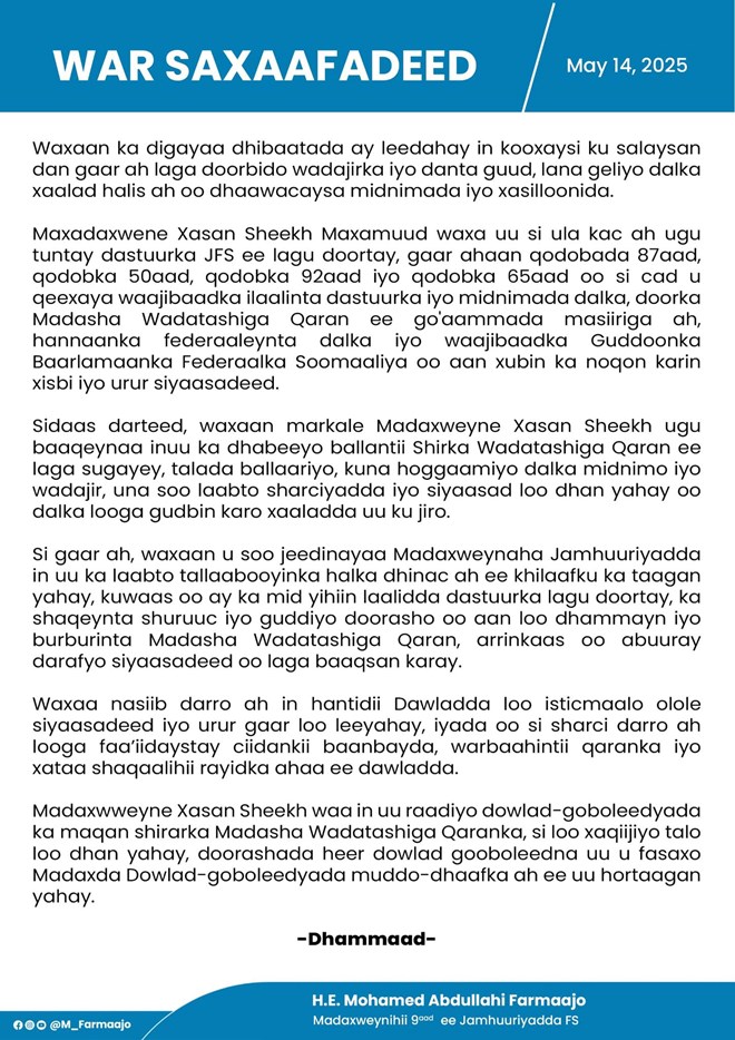 Khamiis, May 15, 2025 (HOL) - Madaxweynihii hore ee Soomaaliya Maxamed Cabdullahi Farmaajo ayaa ku eedeeyay Madaxweyne Xasan Sheekh inuu ku tuntay Dastuurka KMG, Waxaana uu uga digay dhibaatada ay leedahay in kooxaysi ku salaysan dan gaar ah laga doorbido wadajirka iyo danta guud, lana geliyo dalka xaalad halis ah oo dhaawacaysa midnimada iyo xasilloonida.