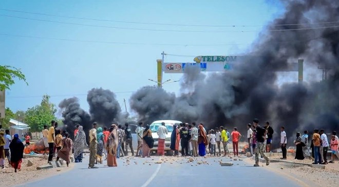 newsinsideDadweynaha ayaa taayirro ku gubay waddooyinka waaweyn ee magaalada, iyagoo dhagax kala hor yimid ciidamada ammaanka oo isku dayay inay kala dareeriyaan.