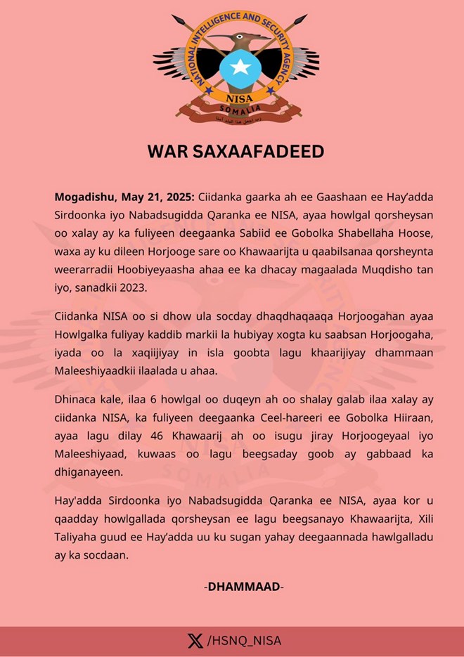 Arbaco, May 21, 2025 (HOL) - Warsaxafadeed kasoo baxay Taliska Hay'adda Nabadsugida iyo Sirdoonka Qaranka ee NISA ayaa lagu shaaciyay in ciidanka gaarka ah ee Gaashaan howlgal qorsheysanaa Xalay ku dileen Horjooge sare oo Al-shabaab u qaabilsanaa qorsheynta weerarada Hoobiyeyaasha ahaa ee ka dhacay magaalada Muqdisho tan iyo sanadkii 2023.