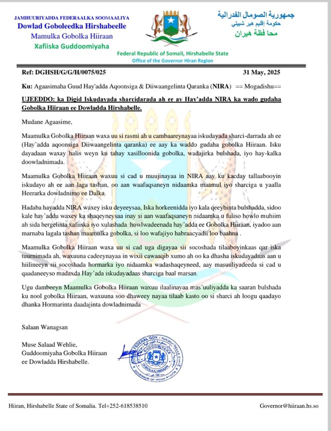 Sabti, May 31, 2025 (HOL) - Maamulka gobolka Hiiraan ayaa digniin adag u diray hay'adda aqoonsiga diiwaan galinta Qaranka ee NIRA oo ay sheegeen iney ku howlan yihiin isku dayo wax u dhimaya xasiloonida gobolka Hiiraan.