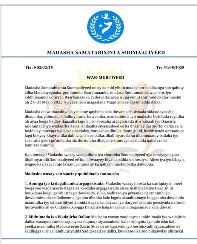 Madashu waxay soo jeediyeen in si degdeg ah loo qabto kulan qaran oo ay isugu yimaadaan madaxda dowladda federaalka, kuwa dowlad-goboleedyada, iyo siyaasiyiinta mucaaradka, si looga tashado badbaadinta dalka, loona mideeyo awoodda iyo abaabulka lagu wajaho argagixisada.